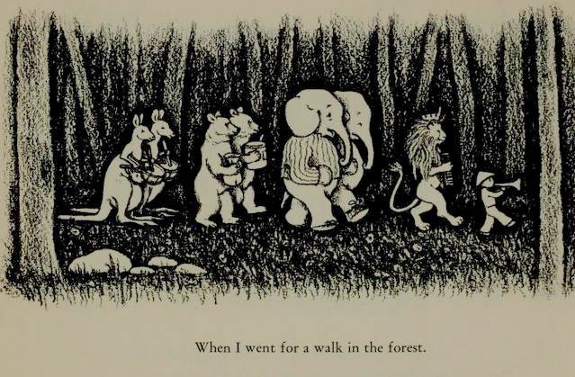 It tells the story of a child who goes for a walk in the forest, and along the way he encounters many animals, including kangaroos, a lion and some bears. He isn’t afraid, however, and they don’t seem very fierce. They all decide to join him and parade through the forest.