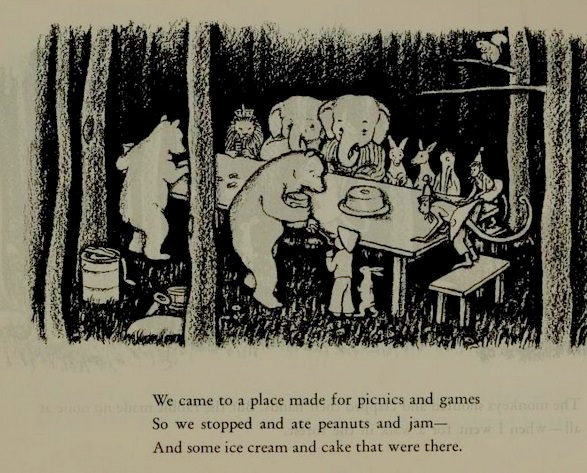 They stop for a picnic of peanuts, jam, ice cream and cake, and then they play games (Drop-the-Handkerchief, London-Bridge-is-Falling-Down, Hide-and-Seek). Eventually the boy’s father finds him and takes him home, but he knows he will come back and play with the animals again.