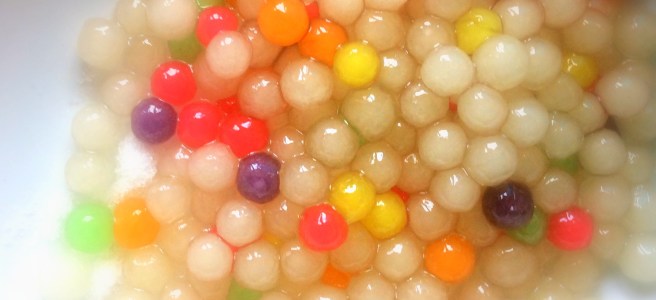First make the milk tea. Boil a cup of water and steep the tea for 5 – 10 minutes. Remove the teabags, add honey to taste, and let the tea cool for another 15 minutes or so. Then add the tea and the milk (I used coconut milk, but if you prefer it not to taste coconutty, then use something different) into a large container with a lid. As you may guess this makes a very weak tea, but I did not want the color of the tea to interfere with the color of the boba, so I intentionally made it pale. You can make it stronger by using less milk or steeping the tea longer. Put the tea in the fridge to cool for a couple of hours. You could add ice and have it ready right away, but I prefer it this way. While the tea is cooling make the boba or tapioca pearls (If you can’t find multicolored ones I would recommend looking in an Asian grocer or online, but any color will do). Boil a large pot of water, add the pearls slowly, and stir. In a minute or so they will float to the surface of the water. Cover the pot and cook on medium heat for 3 minutes. Turn off the heat and simmer another 2 -3 minutes. Strain the tapioca and rest in cold water for half a minute, then strain out and roll in a little sugar or honey.