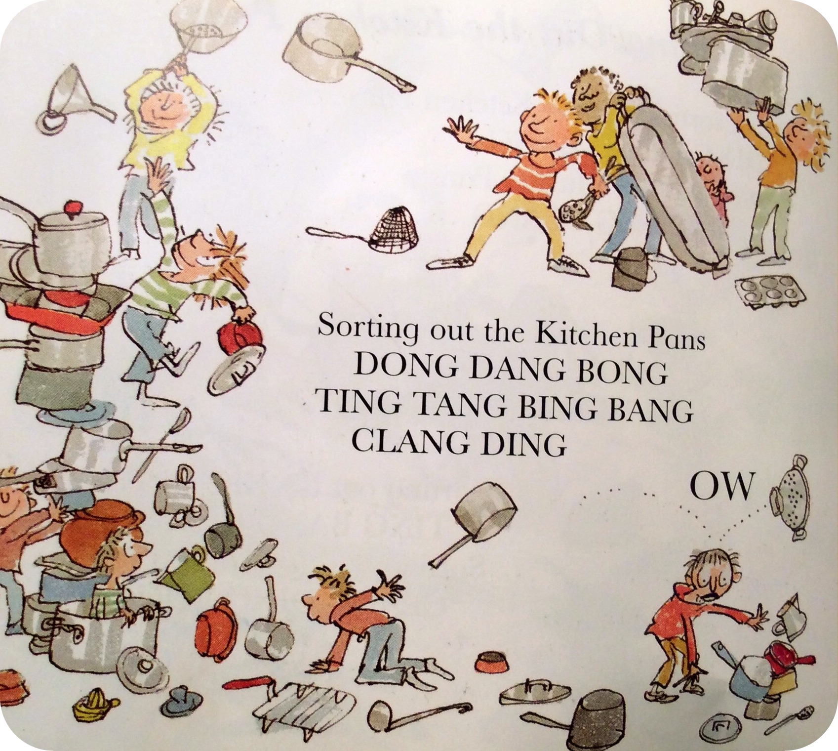 ‘Sorting Out the Kitchen Pans’ is about some more helpful children who take up the noisy task of…sorting kitchen pans.