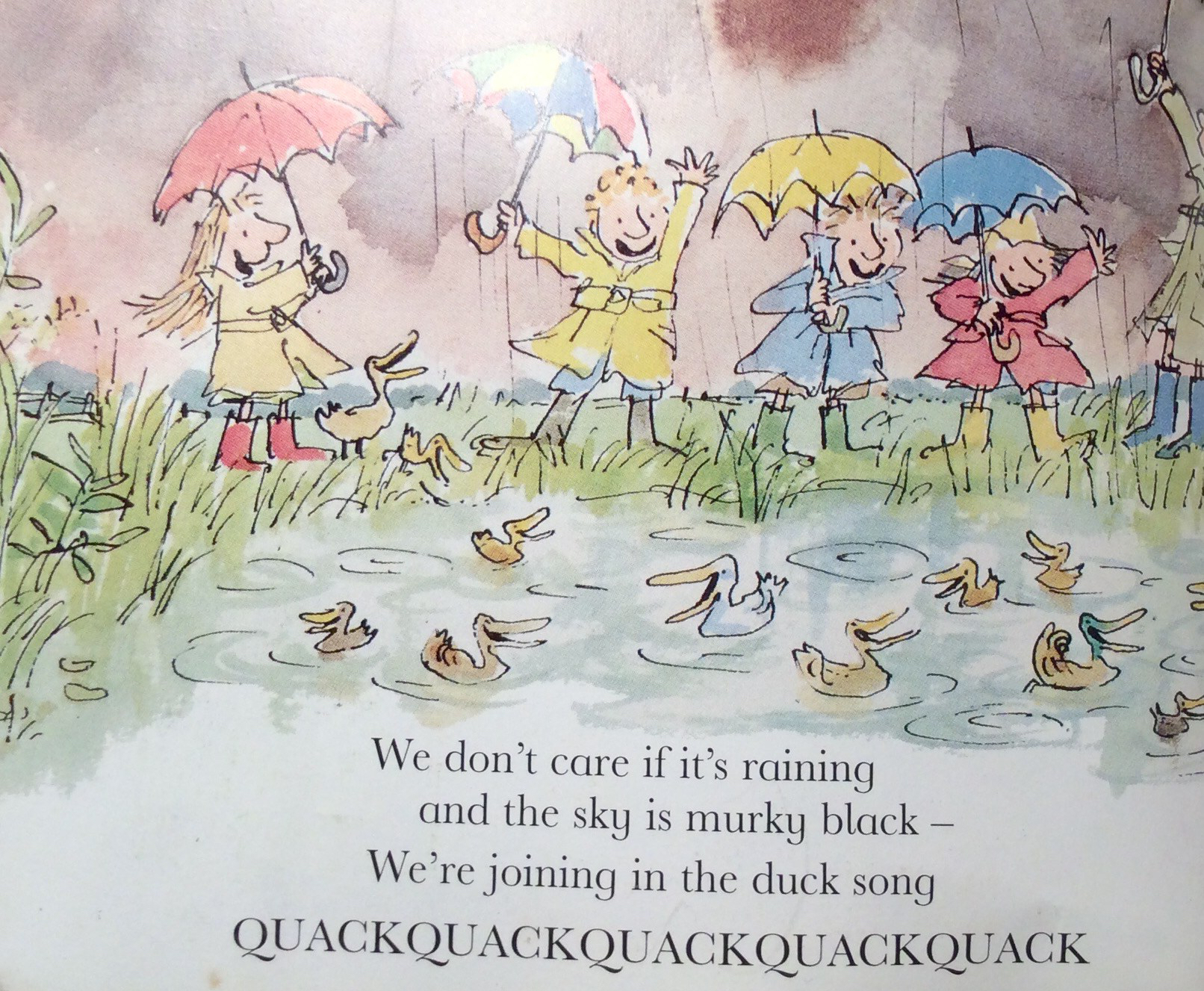 Today’s book is All Join In, a book of seven poems written and illustrated by Quentin Blake. They are loosely related in theme, but all relate to a motley group of family/friends who get up to all sorts of activities, usually noisily and messily, but with great enthusiasm.